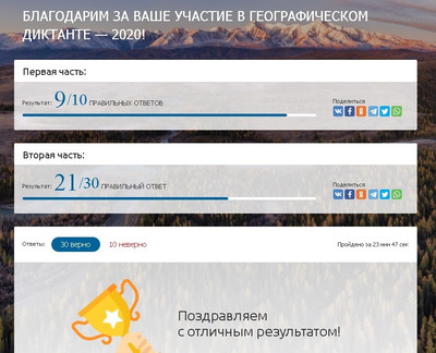 | Вчера я написала прямо во время первого онлайн-диктанта. Его представлял Н.Н.Дроздов. Хотя он, вроде, биолог, а не географ. Там вчера не было вопроса про Дорогу жизни. Сегодня зашла - там совсем другие вопросы и последний, про Дорогу жизни, есть. Я вчера писала с Никитой от площадки 110 лицея, хотя врозь, каждый сам по себе. В конце сообщили, что вопросы с ответами выставят 5 декабря, а итоги вообще только в январе