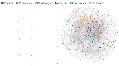 "Согласно Nature, 95 % лауреатов Нобелевской премии (702 из 736) принадлежат к одной огромной сетевой структуре, отражающей их академическую родословную (она здесь понимается в широком смысле – как «наставничество» одного ученого над другим, обычно в форме того или иного научного руководства) Лишь 32 нобелиата (показаны на рисунке слева от гигантского клубка), не принадлежащие к этой академической родословной, каким-то чудом пробились в нобелиаты в обход этой то ли ложи, то ли ордена