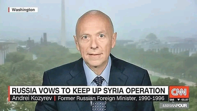 "Бывший министр иностранных дел России эпохи постсоветского гештальта, ныне американец, проживающий в Майами, что во Флориде, Андрей Козырев, является активным экспертом американского телевидение, телеканала CNN. И это лютый пиздец.