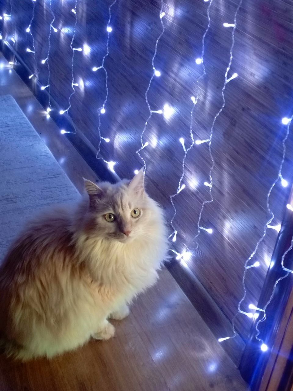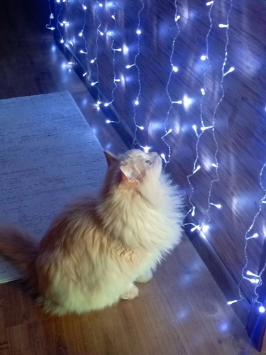 | С наступающим!От нашего очарованного котика Ромашки.На новогоднюю светлячковую занавеску Ромашка смотрит, не отрываясь, уже второй день. С перерывами на кушать и лоток. Ну и сон немножко. Красота не отпускает, светится и манит!Всем счастья, очарованности и благополучия!
