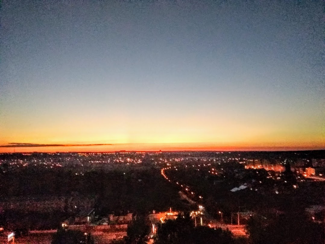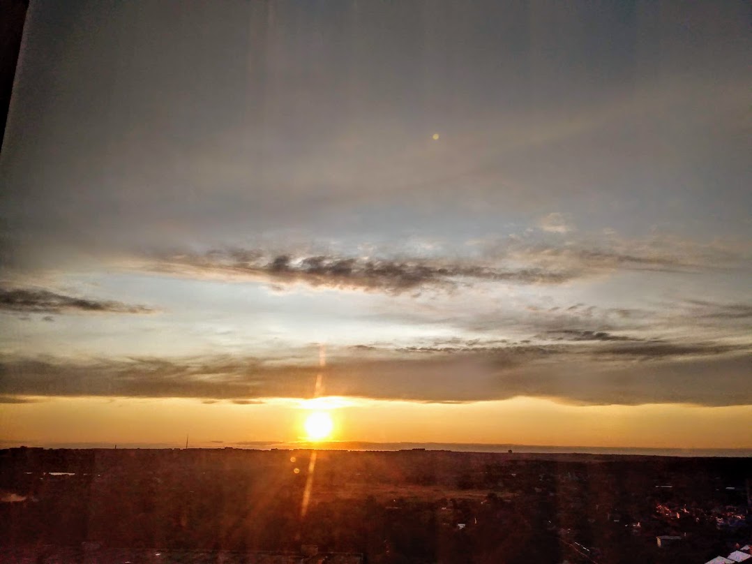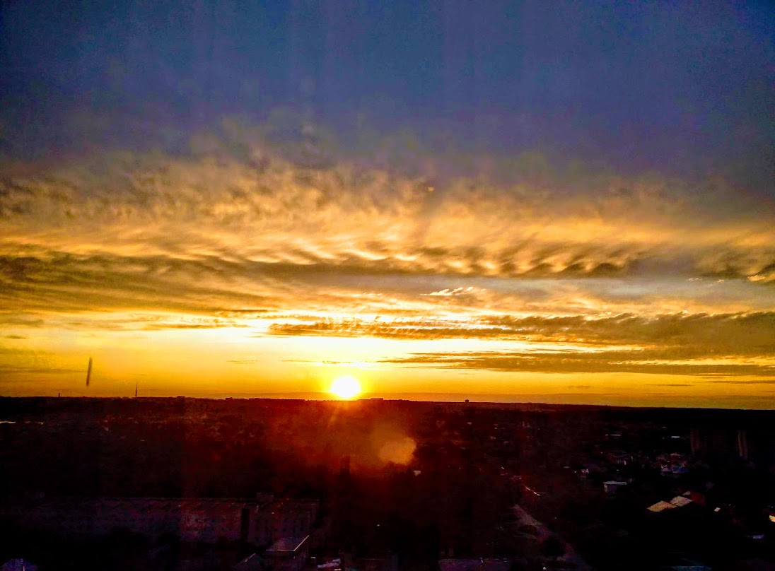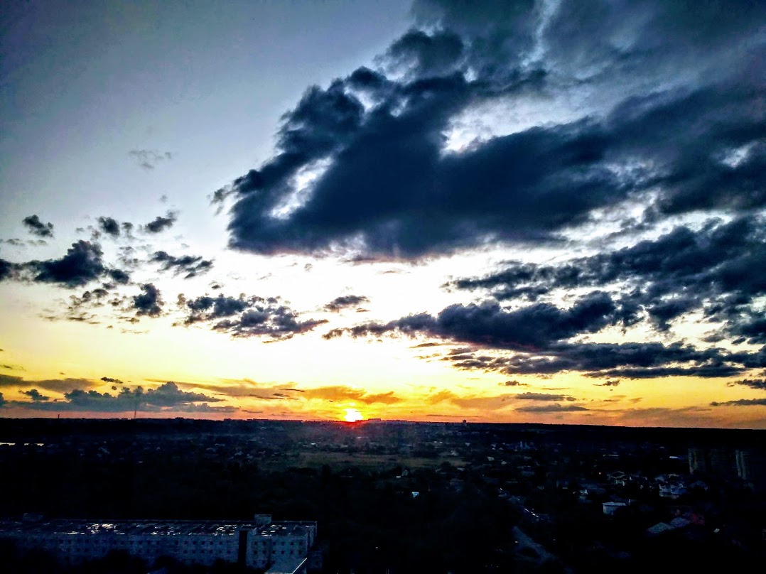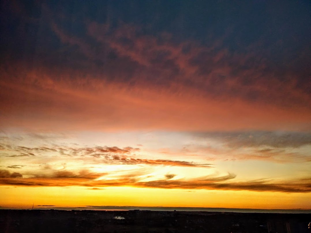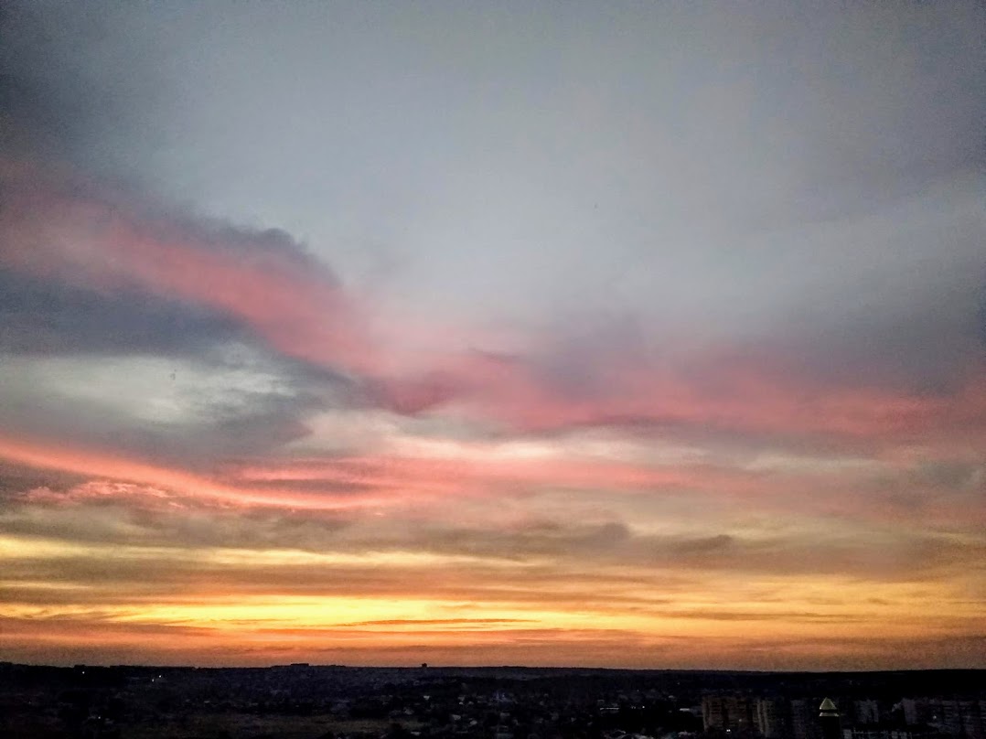 | Никогда не знаешь, даже за минуту, каким будет закат - это всегда что-то новое. Бывает даже солнца уже не видно, оно за горизонтом, но так красиво подсвечивает облака! А иногда вдруг в самый последний момент выйдет из-за туч и тут же скроется, будто подмигнет...Мне повезло иметь такой шикарный вид из окна. Вспоминаю, как мы с Викой бегали от одного окна к другому(три комнаты выходят на запад), и она кричит: Бабушка, скорее! - Всё решают секунды, красоту природа явит только для тех, кто ждет этот момент чуда, где всё сошлось. От рассвета до заката