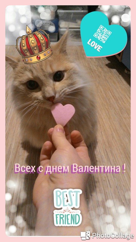 | Наш котенька Ромашка получил на День Всех Влюбленных кусочек докторской колбаски в форме розовой валентинки. Обомлел от счастья.) Я тоже всех пряздрявляю!