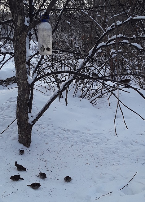| Цитата Alyona (  ) Харитовский парк Начались очные занятия в музучилище им. Чайковского, на Первомайке. И новая встреча с парком после долгой разлуки, с осени 2020-го. Пруд промёрз, воды открытой нет. Но уточки есть. Их кормят на поляне. Как они зимуют - совершенно непредставимо!? Мы засняли только воробьишкину столовую.) На кусте сидят куча чирикалок и отчаянно звучат. По очереди лезут в кормушку, полную зёрен, быстренько клюют, вылетают. На их место лезут следующие. Впервые вижу такую человеческую организацию питания.)))