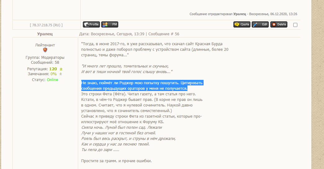 Не знаю, поймёт ли Роджер мою попытку пошутить. Цитировать сообщения предыдущих ораторов у меня не получается. Это строки Фета (Фёта). Читал газету, а там статья про него. Кстати, в чём-то Роджер бывает прав. (В корне не прав он лишь в одном. Считает, что я нулевой сочинитель. Наукой давно установлено, что я сочинитель семистепенный.) Сейчас я приведу строки Фета из газетной статьи, которые про- иллюстрируют моё отношение к Форуму КБ. Сияла ночь. Луной был полон сад. Лежали Лучи у наших ног в гостиной без огней. Рояль был весь раскрыт, и струны в нём дрожали, Как и сердца у нас за песнею твоей. Ты пела до зари .....