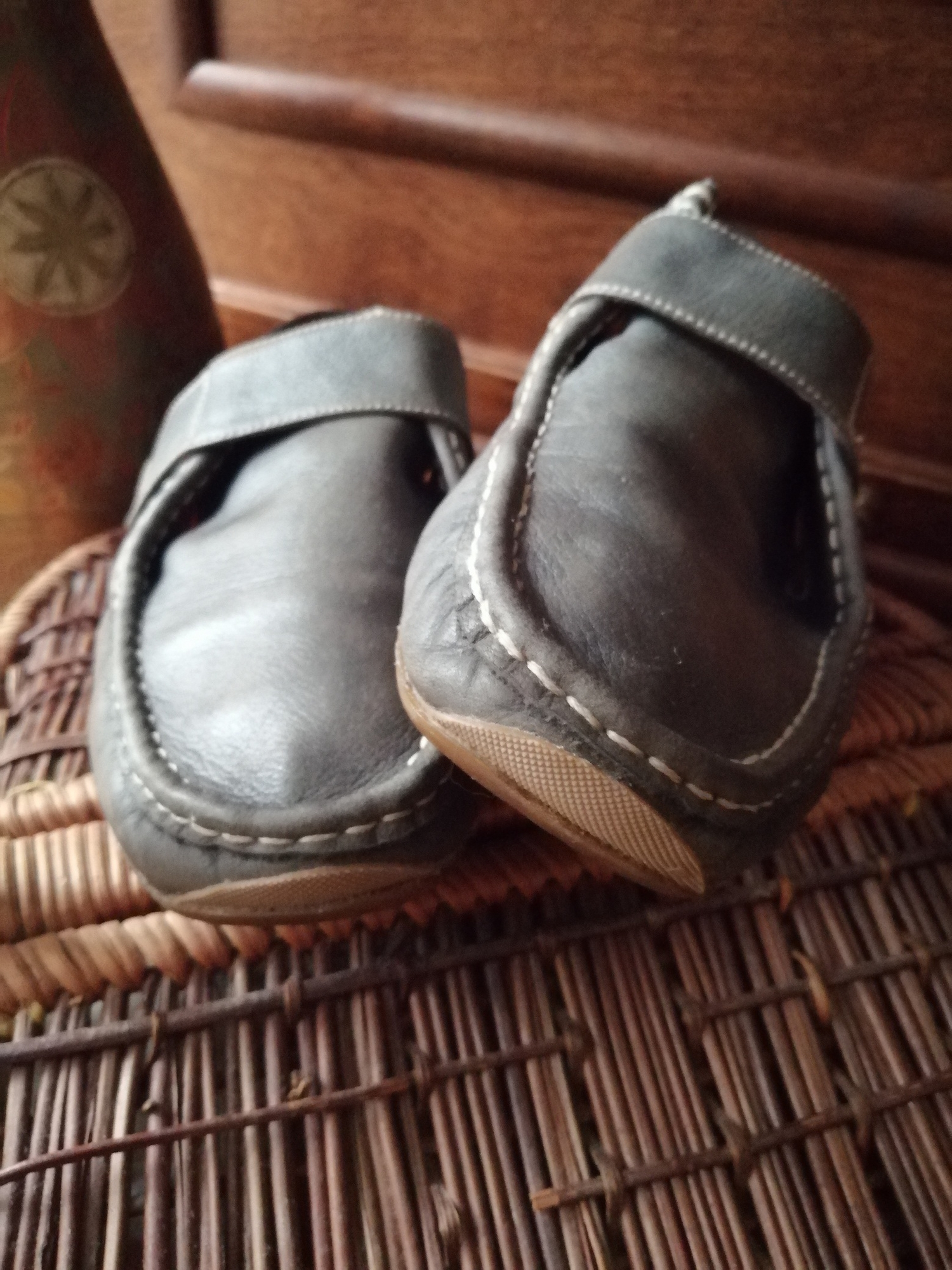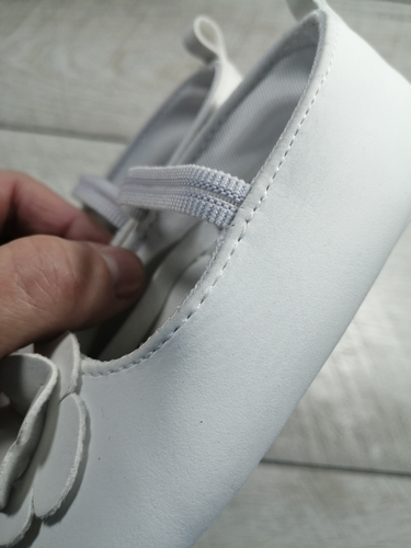 Детские туфельки. Размер 9-12 см. Нужно заменить резинку на чуть большую, чтоб не передавливала ступню. Как сделать? На машинке не прошить. Грубая лапа оставит след не тонкой белой коже. Шила вручную. Сохранила верхнюю нитку. С помощью специального шва утопила стежки в свои родные отверстия.