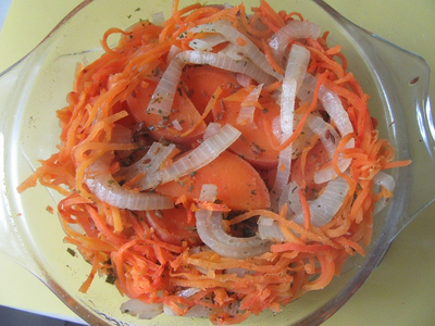 Чистая фантазия. Батат + что под рукой было. Лучок-морковочка, соус-травки.