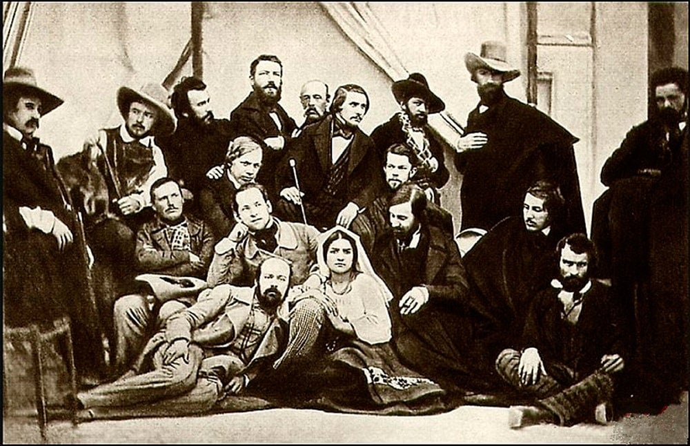 | Единственное фото Гоголя. Да-с, Николая Васильевича. В центре с тростью. Снят в компании именитых художников разных направлений. Дама среди них - это натурщица. Тоже, надо понимать, знаменитая.