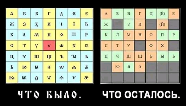 | "Изначально русский язык был образным, но, когда убрали образы, то стал он безобразным. У нас было 19 гласных, которые гласили - сообщали какой-то образ. Их между собой и согласовывали согласные, чтобы были согласно образу. Сейчас осталось 9 из 19 гласных! В словаре Даля изначально было 250 000 слов. В современном – 120 000. В еврейском языке процесс противоположный. Вначале, в арамейском было 22 буквы. В древнем иврите 28 букв, в современном 32. Т.е. нам они обрезают язык, сделали его безобразным (смотри Буквица). Упрощение – это всегда деградация. Развитие – усложнение. Для оглупления нашего народа постоянно организовывают реформы языка. ѦЗЫКЪ – это беЗценное достояние наРОДа. Язык первичен, мысли и поведение человека – вторичны. Чем примитивнее язык, тем примитивнее мышление и поведение человека. И наоборот: чем сложнее, разнообразнее и богаче язык, тем разнообразнее и богаче мышление человека. Если Вы хотите оглупить человека, надо просто оглупить его язык."