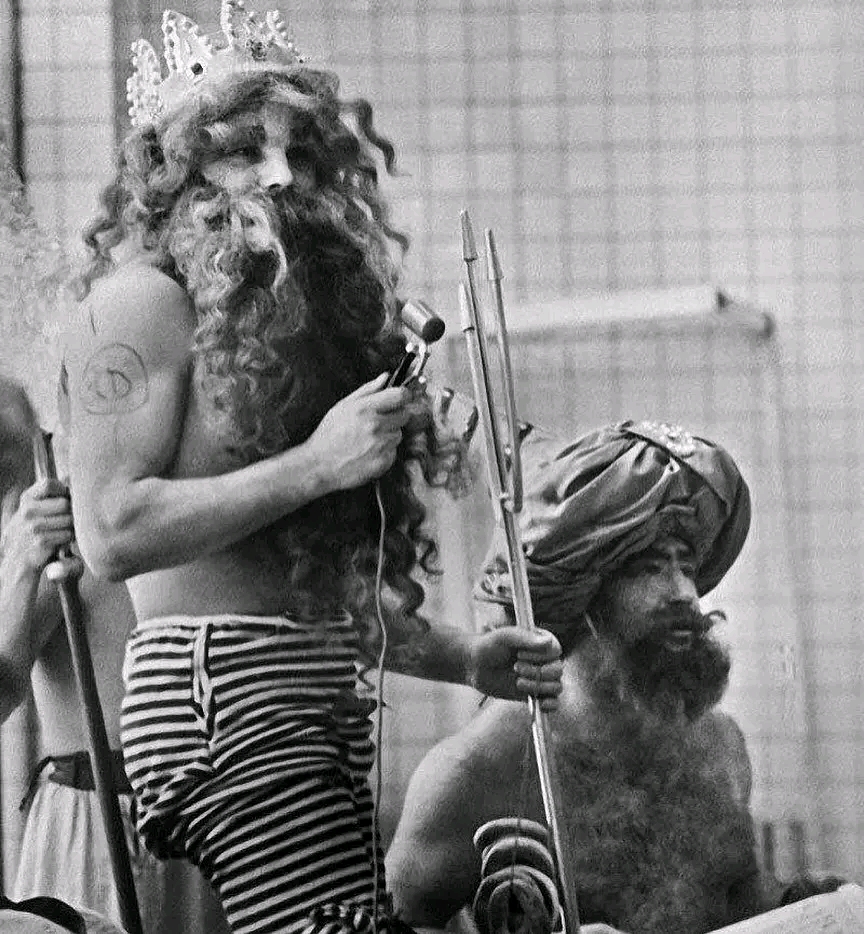 Воот! И я не узнала их. А ведь это два героических космонавта - Юрий Гагарин, стоит с микрофоном в роли Нептуна, и космонавт Леонов сидит в чалме на празднике Нептуна в Звёздном городке)))