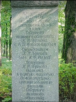Дополнение о судьбах персоналий. Памятник на месте дуэли К.П.Чернова и В.Д.Новосильцева. Открыт 9 сентября 1988 г. Установлен в парке Лесотехнической академии. Архитектор Владимир Сергеевич Васильковский (1921 – 2002). Гранитная стела, высота 250 см. На стеле выбита надпись: «10 сентября 1825 года на этом месте состоялась дуэль члена Северного тайного общества К.П.Чернова с В.Д.Новосильцевым. Секундантом К.П.Чернова был К.Ф.Рылеев. Похороны К.П.Чернова вылились в первую массовую демонстрацию, организованную членами Северного тайного общества – декабристами». Памятник находится неподалеку от современного дома 1/107 по Новороссийской ул. (Лесотехническая академия, факультет механической технологии древесины), рядом с одноэтажным флигелем лаборатории тепловой обработки, сушки и защиты древесины. Определить место дуэли было несложно: мать убитого Новосильцева, Екатерина Владимировна, урожденная гр. Орлова, возвела в свое время на месте дуэли церковь равноапостольного кн. Владимира при Орлово-Новосильцевском благотворительном заведении, место же расположения церкви определяется как пересечение пр. Энгельса и Новороссийской ул. В июне 1932 г. церковь была взорвана (см.: Антонов В.В., Кобак А.В. Святыни Санкт-Петербурга: Историко-церковная энциклопедия: В 3 т. СПб., 1996. Т. 3. С. 35 - 37). Инициатором установки объекта была Тамара Александровна Зуева (1914 – 1999), старейший работник Лесотехнической академии (с 1932 г.), директор Фундаментальной библиотеки в 1953 – 1977 гг. «В 30-х годах прошлого века на месте дуэли были положены круглые гранитные плиты, обозначившие позиции дуэлянтов. В 1946 или 1947 году эти плиты исчезли. В 1962 году (после публикации в “Лесной правде” исторического очерка Т.А.Зуевой) удалось восстановить их на прежнем месте. По ходатайству общества охраны памятников нашего района и Лесотехнической академии исполком Выборгского райсовета принял решение об установлении <…> мемориального знака <…>» (Александрова Т. «Клянемся честью и Черновым…» // Лесотехник. 1989. 22 марта. № 10/11). См. упомянутую статью: Зуева Т.А. История одной дуэли // Лесная правда. 1962. 22 марта. № 11; 29 марта. № 12.