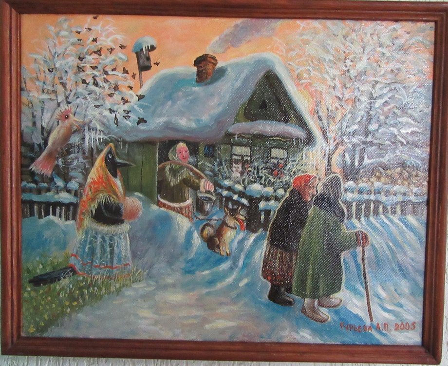 Малышонок мой учится музыке в училище имени Чайковского. А училище, как обладатель длинных казенных коридоров с гладкими стенками, перемежающимися дверьми в классы, отдает площади этих стенок под замечательно захватывающие вернисажи всяких разных художников, любителей и профессионалов. Картины часто меняются. Вывешиваются и перевешиваются. За учебный год больше десятка выставок сменились, не считая просто украшений коридорных. По активности использования стенок можно сравнить с хорошим выставочным залом. И вот, пока идут занятия хором там... фортепьянами и прочими сольфеджиями, мне иногда приходится скрашивать минуты ожидания рассматриванием этих шедевров живописи. Они самые разные по тематике и по качеству. Какие-то очень высокохудожественные, какие-то просто картинки. Ну, тут на вкус и цвет. Но вот весной на стенах холла второго этажа развесили картины, выставку художницы Александры Петровны Гурьевой-Сажаевой, от которых я впала просто в ступор от невозможного, редчайшего в моей жизни восторга. Да-с. Оказалось, что она не новичок в этом деле. Очень известная и международно признанная художница, землячка, из простой уральской деревни под характерным названием Глухово, Богдановичского района Свердловской области, поделилась своим творчеством перед студентами, детьми и просто гостями музыкального училища.